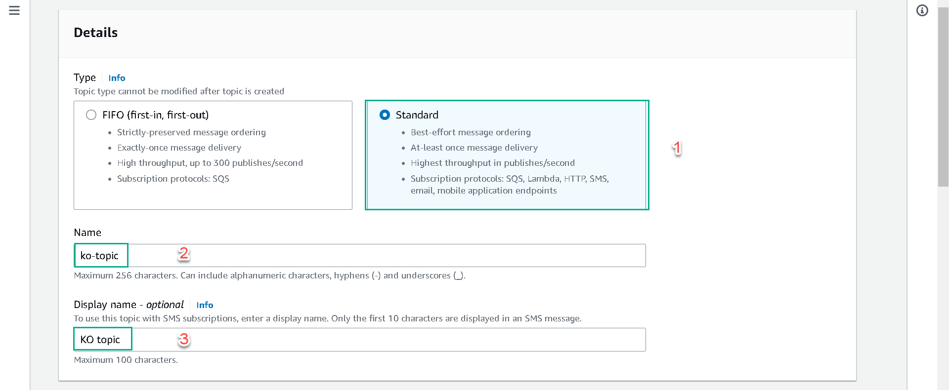 3.When Create topic opens. Choose Standard and includes your name and optionally a Display Name.