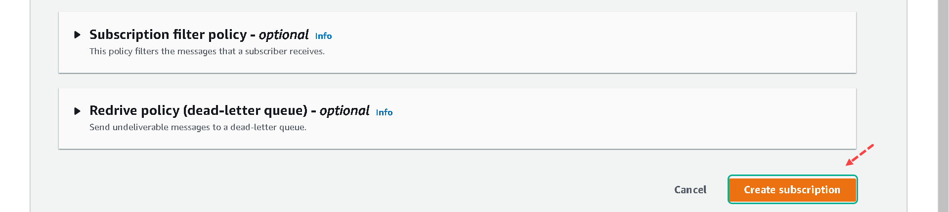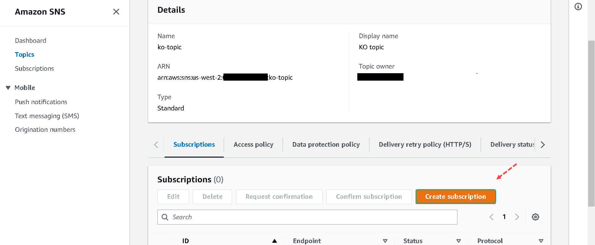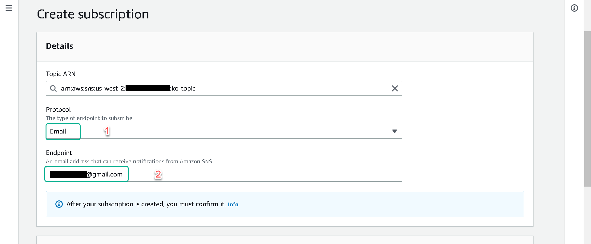 5.In the Protocol, choose Email and enter a working email address you are able to access. Click Create Subscription.