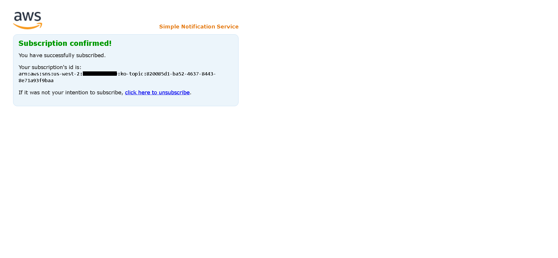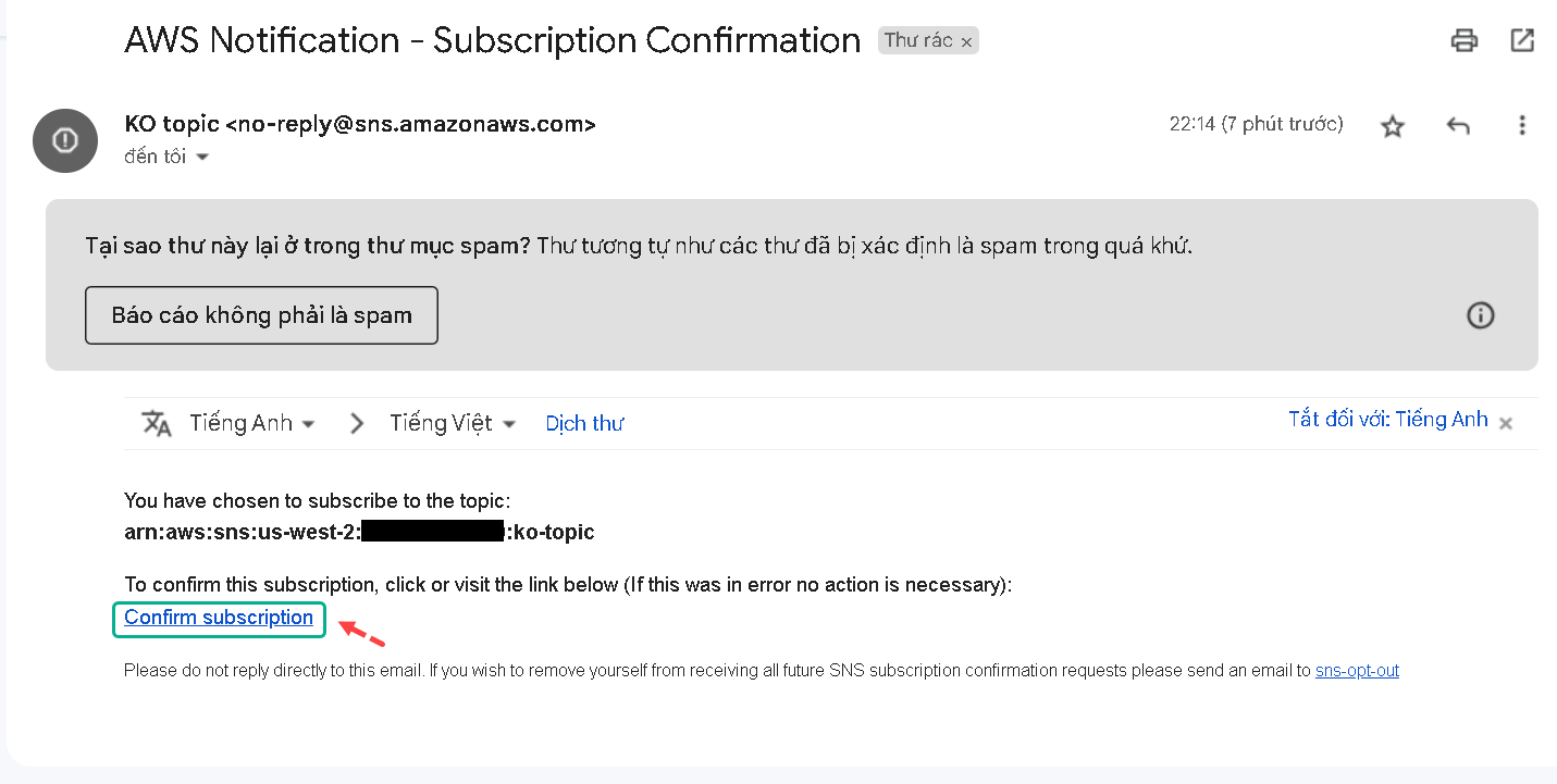 6.Check your email, open the email name AWS Notification – Subscription Confirmation and click Confirm subscription link.